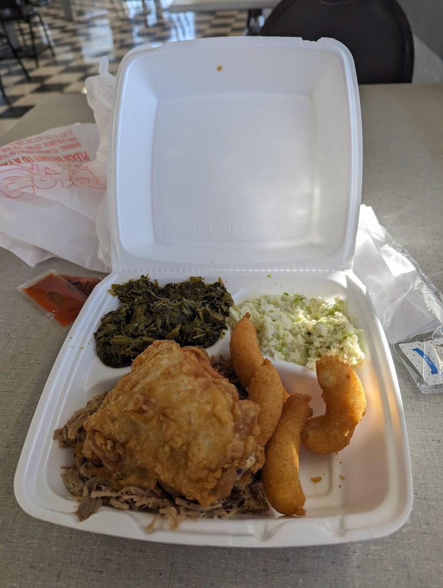 I live in Beaufort, NC but have family in Fayetteville, NC. This restaurant is on my route back and forth. I have passed it a hundred times noticing a huge line for the takeout. I made it my mission to try this place on my way home. I ordered the 2 piece fried chicken with cole slaw and potato salad. The lady taking my order was friendly and welcoming. It came out hot and fresh. I guess because the chicken pieces were on the smaller end of sizes, it was actually a 3 piece meal (one of the pieces was hidden under the thigh piece). The chicken skin was crispy and the meat was juicy. The coleslaw and potato salad was home made and delicious. The hush puppies were great. I will be back and I will try the barbecue next. Highly recommend!