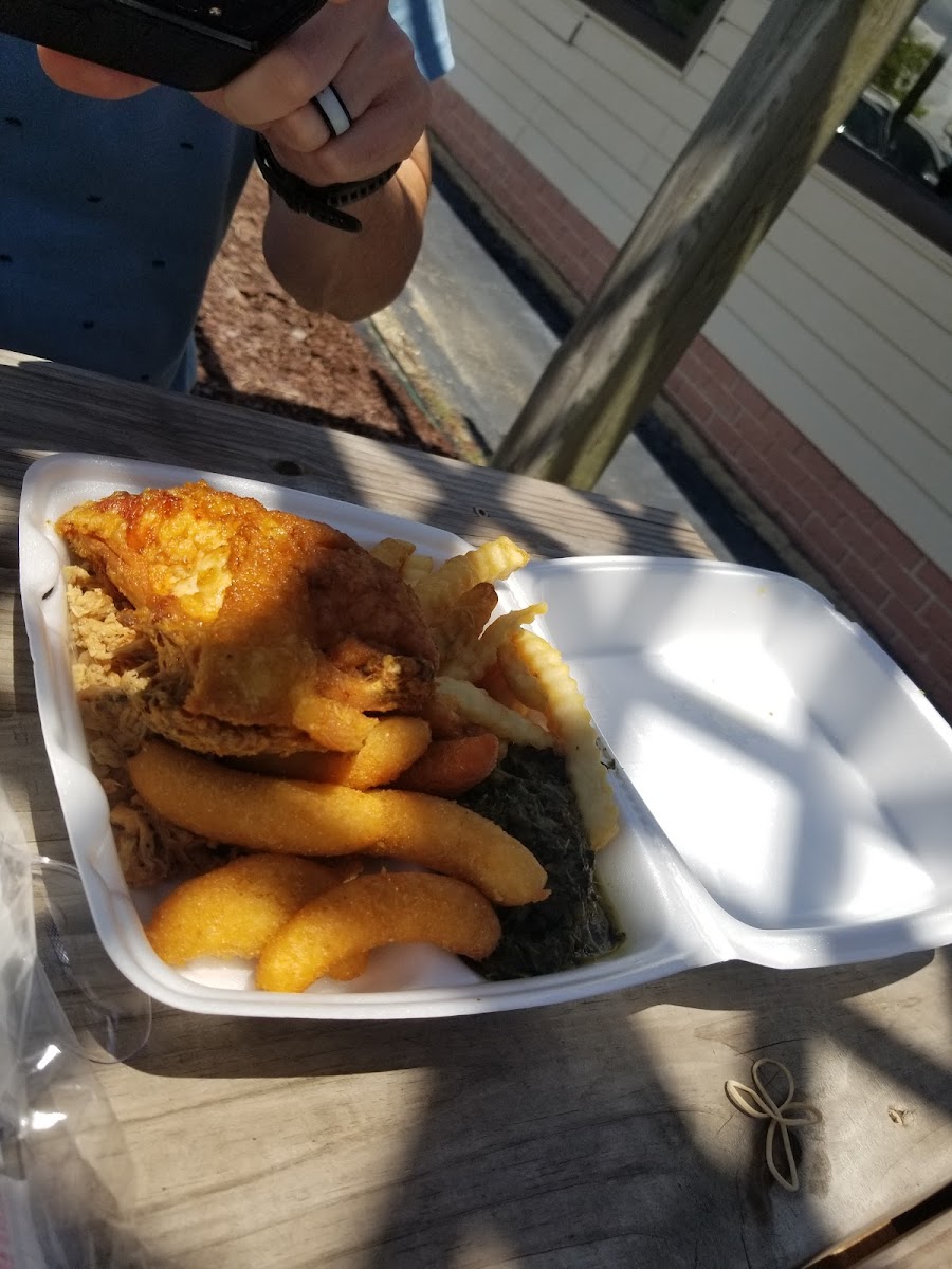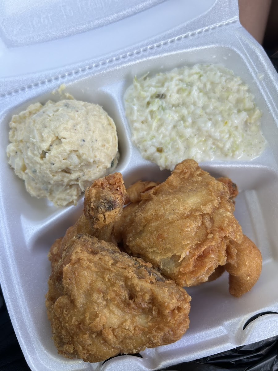 Stopped in yo get some fried chicken and decided to take it home. Going inside was way faster than the drive through. Chicken was juicy yet crispy but the sides were standout..beans, coleslaw and potato salad. Fresh, homemade and just delish. Saved my crispy hushpuppies for dessert. We definitely will be back.