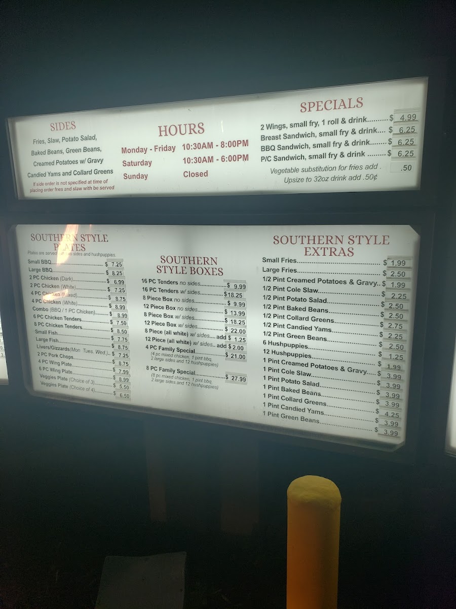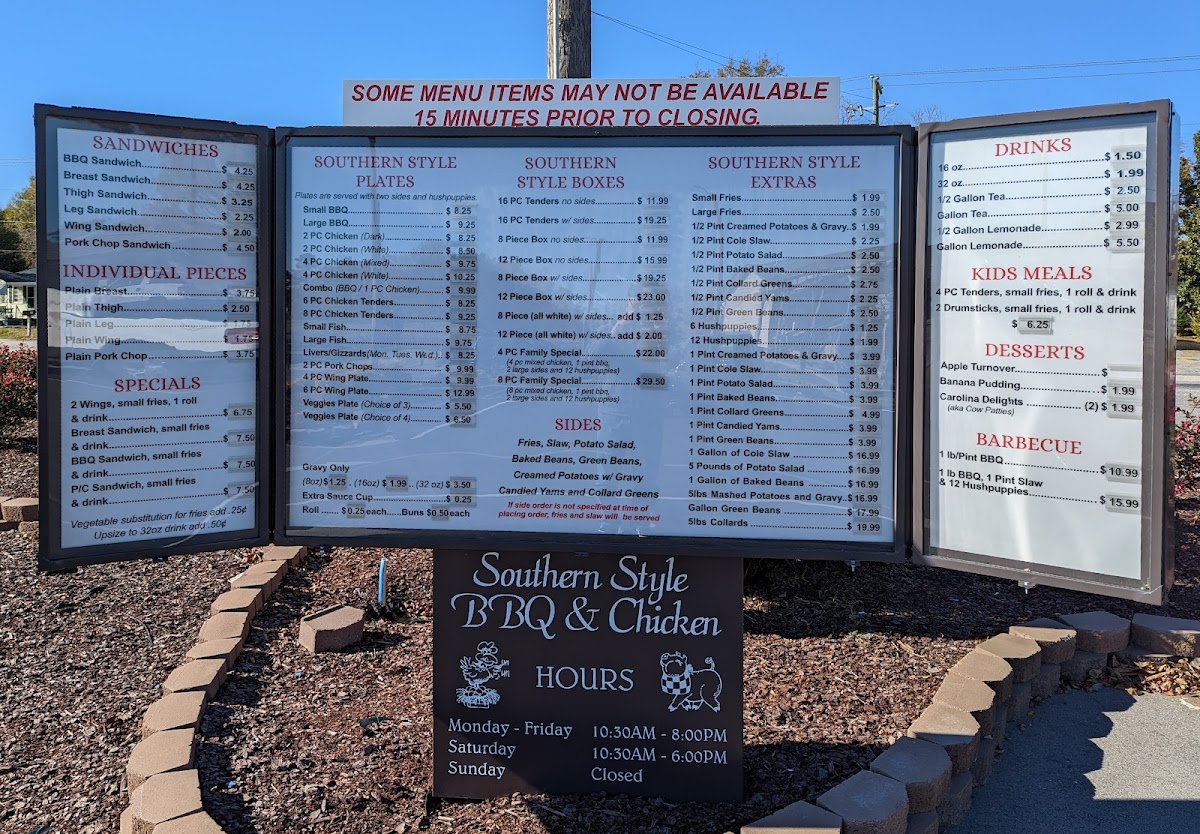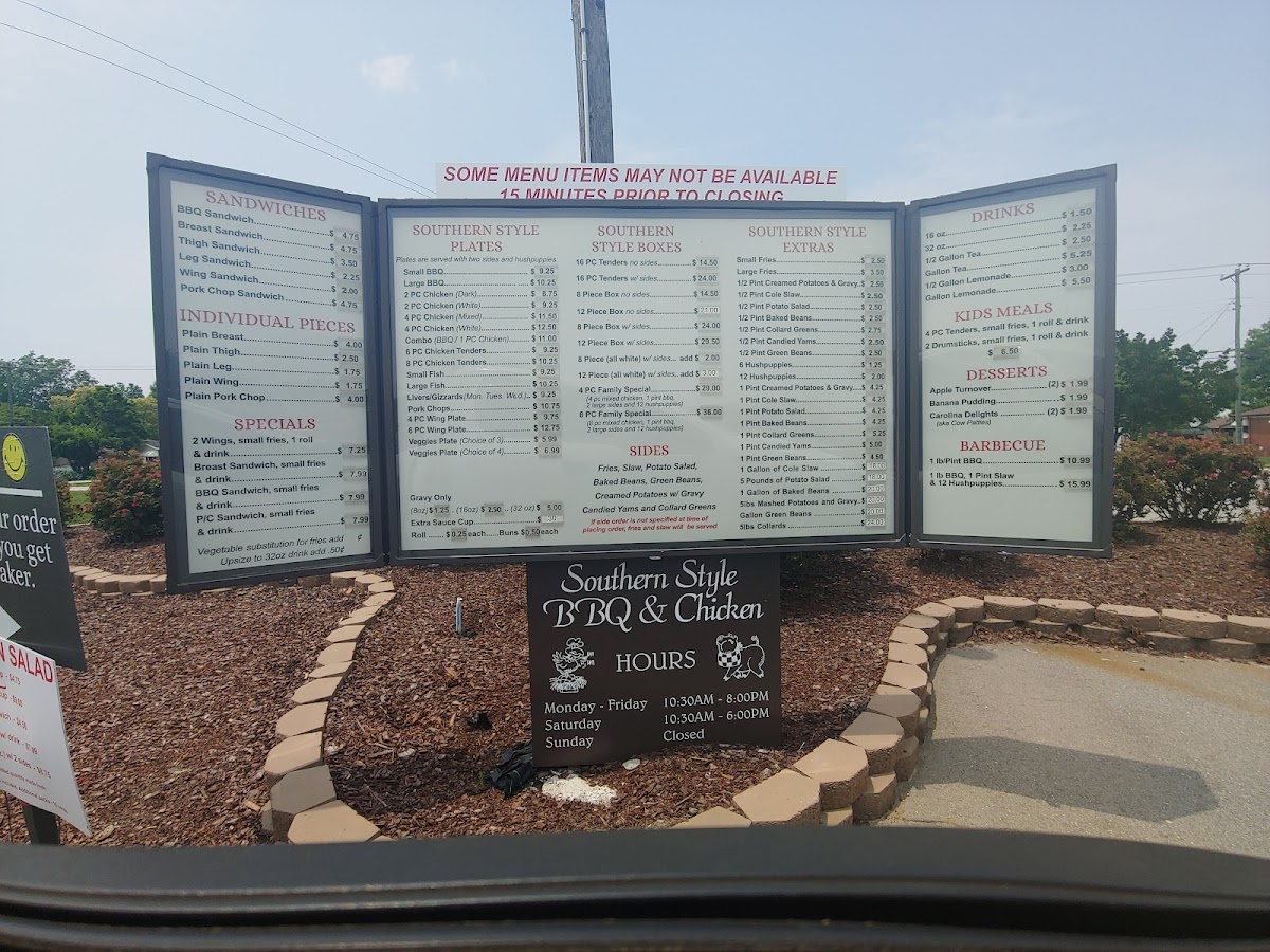 Southern Style Barbecue & Fried Chicken offers a straightforward, satisfying menu centered on classic Southern comfort food. Whether you’re stopping by for a quick lunch or settling in for a casual meal, you’ll find a selection of hearty barbecue plates, fried chicken, and familiar sides that create a welcoming, no-frills dining experience.